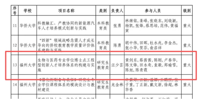 汪少芸院长牵头、联合医学院黄剑东院长、省立医院陈刚院长等联合申报的“生物与医药专业学位博士点工程型创新人才培养体系的构建与实施”项目,成功获批福建省重大教育教学改革研究项目,实现了日韩成人